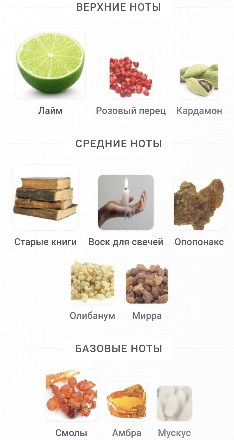 Средние ноты: Старые книги, Воск для свечей, Опопонакс, Олибанум и Мирра