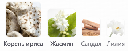 Ноты: Лилия «Мадонна», жасмин крупноцветковый, ирисовое масло, сандаловое дерево из Майсура