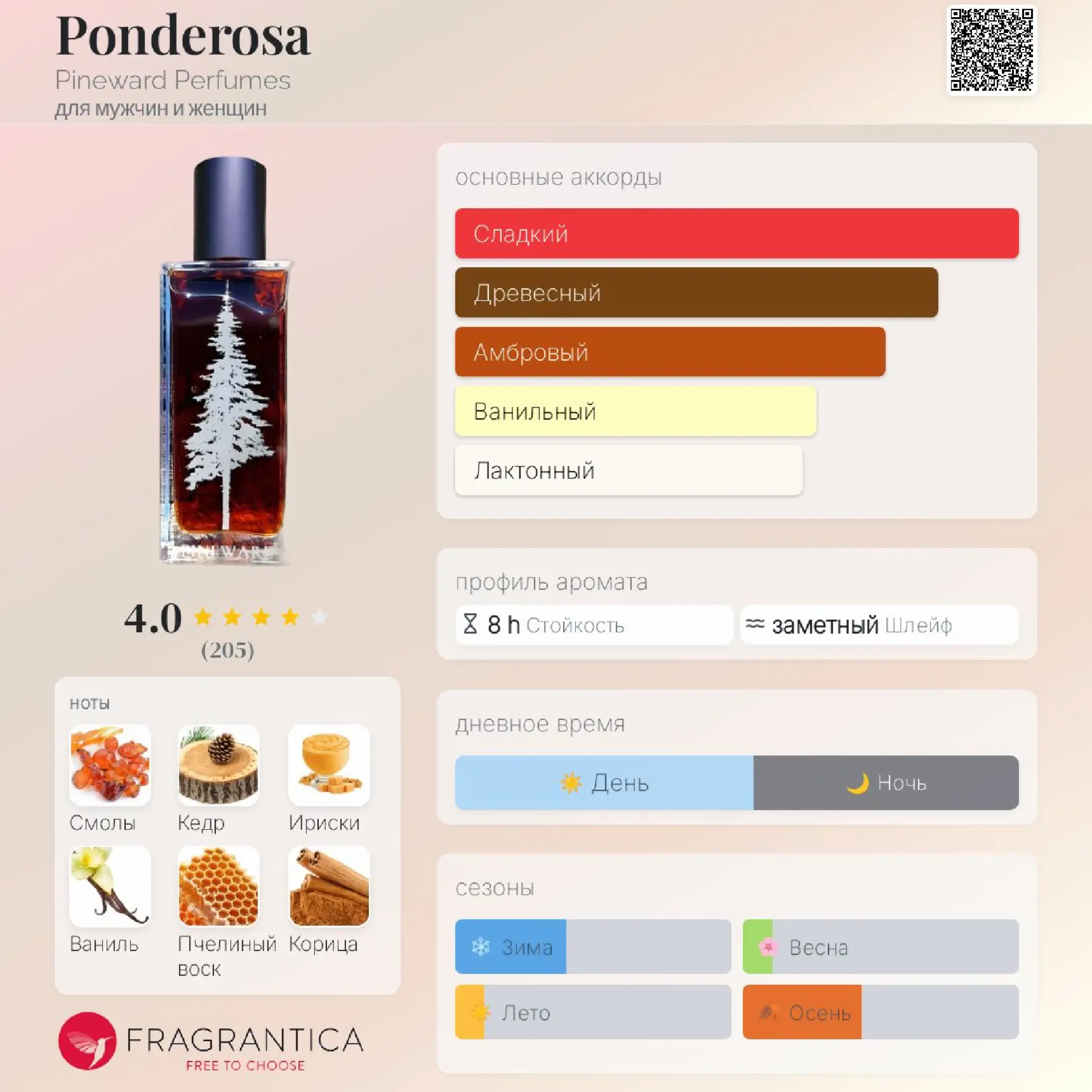 Ноты: смола пихты, хвоя пихты, кедр, ваниль, клубника, корица, ириски, пчелиный воск, печенье с изюмом.